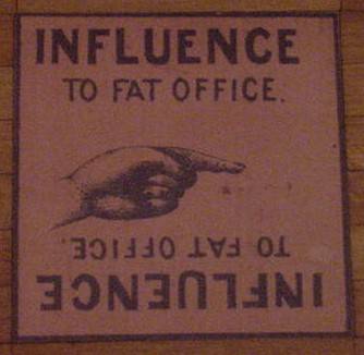 Happy Old Age was worth 50 points. Getting there was half the game – the other half was how you got there.  Avoid gambling, which leads to ruin; intemperance, which leads to poverty; idleness, which leads to disgrace; and crime, which leads to prison.  You don’t get any points for those, and prison makes you lose a turn.   Cupid will get you to Matrimony, but Matrimony doesn’t get you any points.  Perseverence leads to success, and that’s worth five points; school leads to college, another five points; honesty leads to happiness, also worth five points; politics will lead you to Congress, five points; Influence leads to Fat Office, which is five points too; and a Government Contract leads to Wealth, which is worth ten points. The Government Contract square used to be a Speculation square, but that was a little too much like gambling.