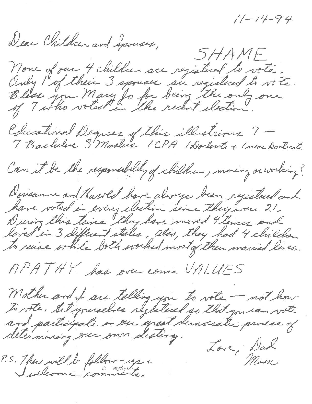 Funny how our memories work. I can see you making that connection. But Al Gore and the hanging chads happened in 2000, six years after that letter was written. So the switch might have begun then, but mobilizing us to vote in 1994 was, I think, independent of our political sway. Come to think of it, if we all voted I think we’d basically have canceled each other out. Though that’s beside the point. ;-)