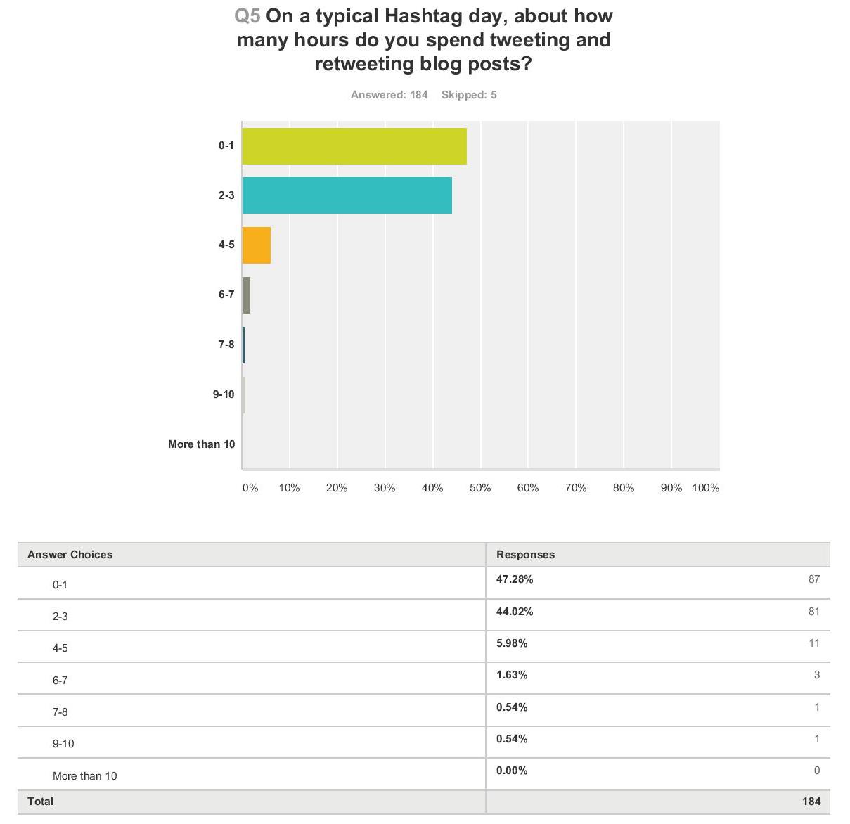 If self-reported data is accurate here, 91% claim to spend three hours or less tweeting and retweeting other blog posts. This is divided almost equally between people who report an hour or less (47%) time on Twitter, and those who spend two to three hours (44%).