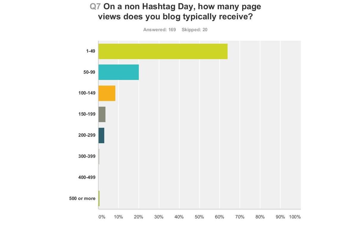It should be noted here that while about a third of all respondents – 32% – said they read 4-6 blog posts, 34% who responded read nine or more posts on a hashtag day. Someone pointed out that the survey may be self-selecting on this score; after all, people had to read my post to access the survey in the first place.