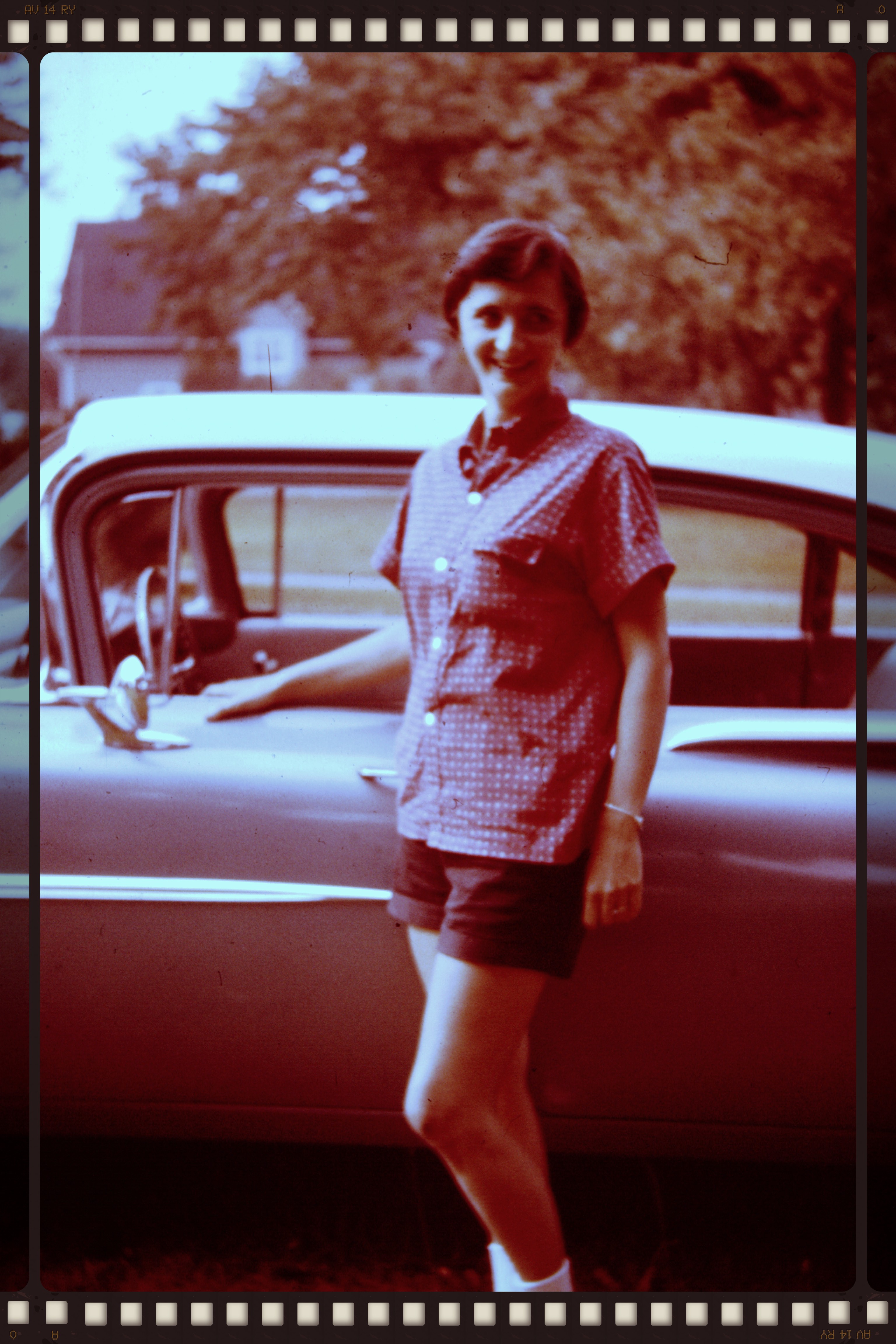 It is hard to find pictures of my mother alone after she’s married. This one was taken in 1961 at her parents’ house on Schaal Ave. in Erie, PA. She was 29, and the mother of two. Was the car new?