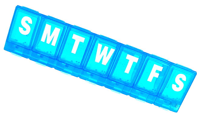 My cousin Cindy and I had gone up to see her apartment. It didn’t take long to find the source of the smell. The toaster oven light was on, and inside was what looked like a lumpy blue caterpillar. On its back the letters SMTWTFS slid incomprehensibly into one another.