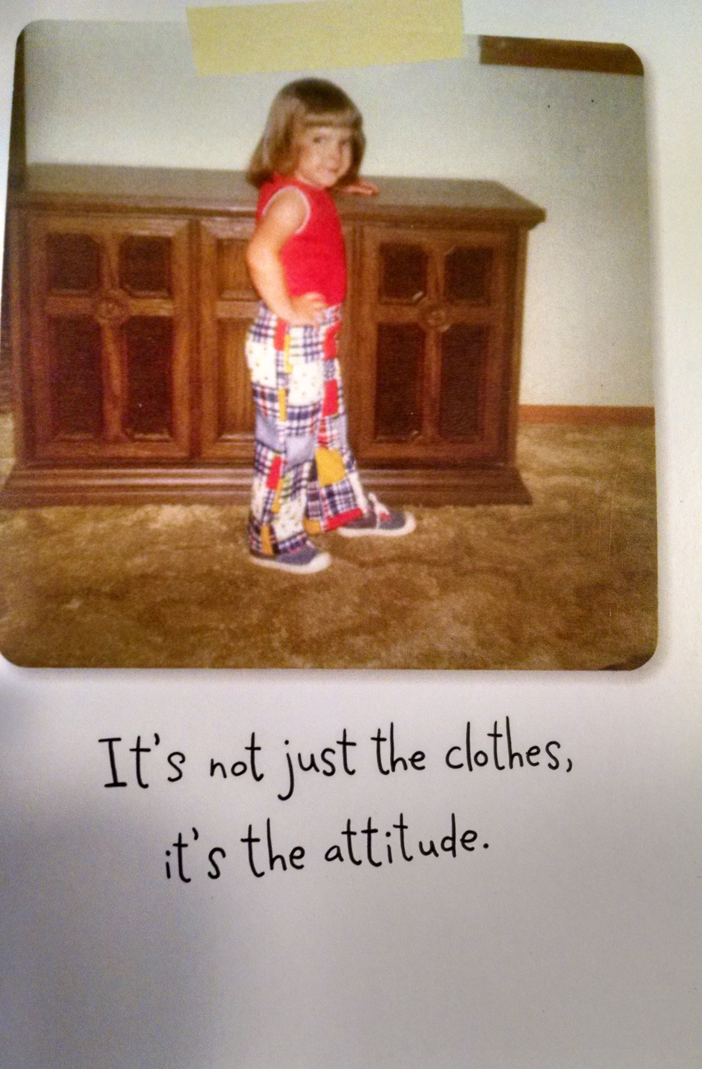 It was a card I picked out especially for her. Not a sentimental card in the traditional sense. On the front cover was a photo of a little girl in a 70s version of bad plaid pants. The inscription read: “It’s not just the clothes, it’s the attitude.”