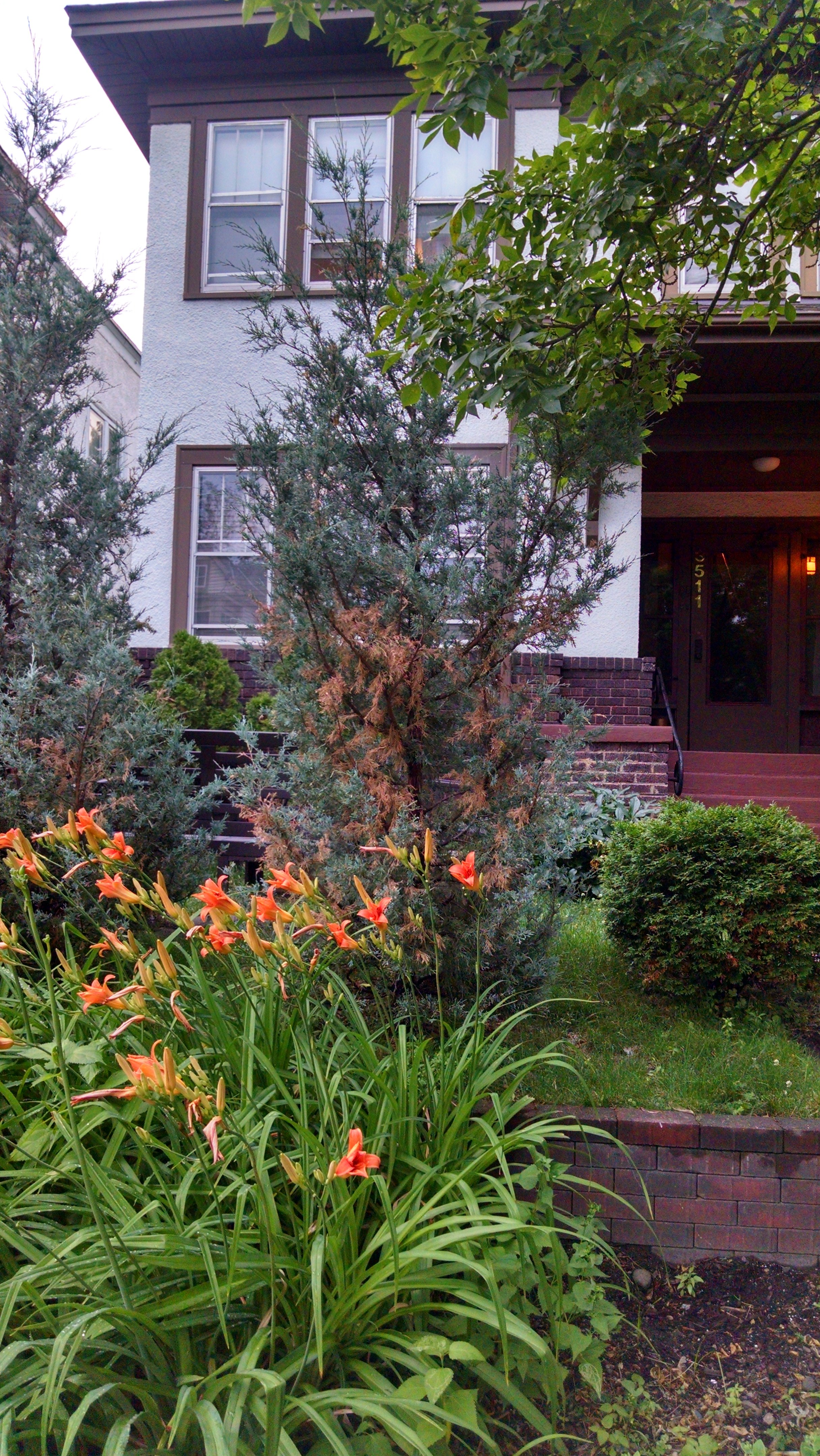 I take a good look at the façade of the building, the cluster of tiger lilies in front, the fur trees, one with some brown in the middle. There are benches out front, and last week while I was waiting for a friend to pick me up for breakfast I deadheaded all the peonies. Perhaps it was my imagination, but they seemed relieved.