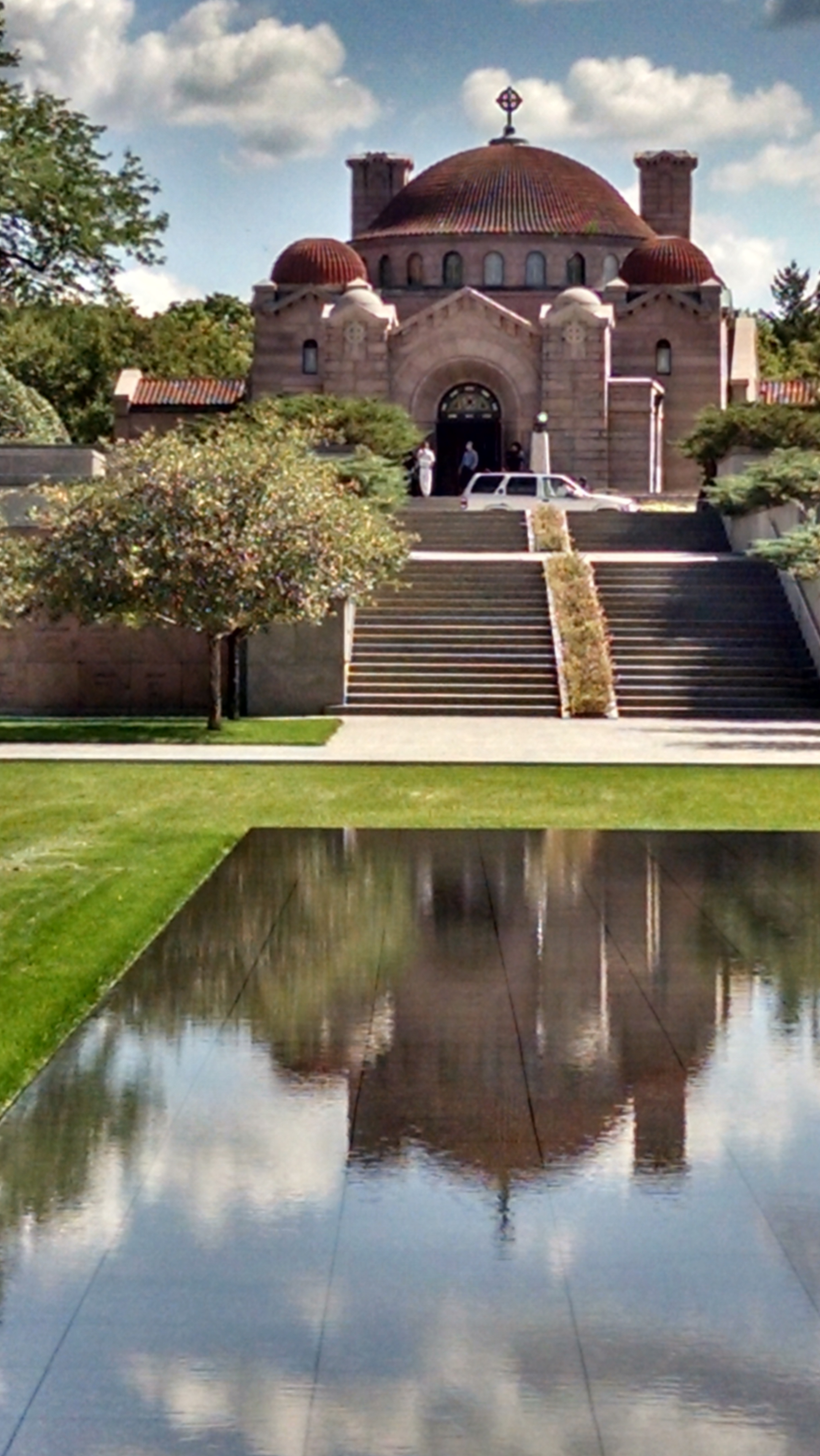 KB is interested in the reflective “pool,” in front of the Garden Mausoleum, which is really more of a water sculpture, creating a shimmering surface over an array of tiles. But she tugs on AB’s skirt and ask why they call it a pool if you can’t swim in it. You can’t even really wade in it. Then she asks for pennies to make a wish with, and AB has to say no, and reminds KB about the trolley ride.