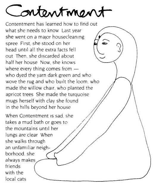 Contentment has learned how to find out what she needs to know. Last year she went on a major housecleaning spree. First she stood on her head until all the extra facts fell out. Then she discarded about half her house. Now she knows where every thing comes from-who dyed the yarn dark green and who wove the rug and who built the loom, who made the willow chair, who planted the apricot trees. She made the turquoise mugs herself with clay she found in the hills beyond her house.