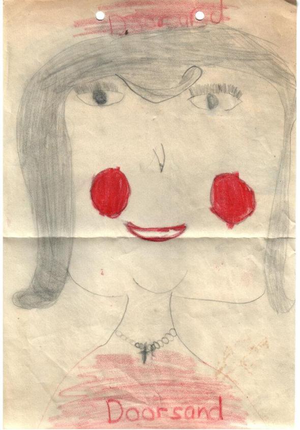 I drew this picture in kindergarten. In it her cheeks are very red and rosy, and an exact Crayola match for her smiling lips. Her hair flips out on both sides like a ski jump. She has a curl in the middle of her forehead. Her eyelashes are the size of porcupine quills. At the bottom of the picture I have carefully lettered the name she had that was not “Mom”; the name my father called her.